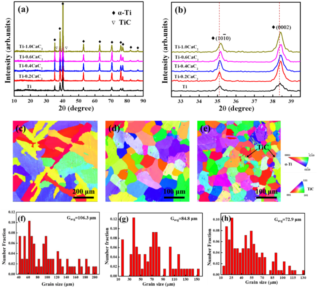 图2 CP-Ti和Ti-xCaC2合金的XRD分析(a-b)和EBSD分析(c-h);CP-Ti(c,f),Ti-0.4CaC2(d,g)和Ti-1.0CaC2(e,h)的IPF图和晶粒统计图。