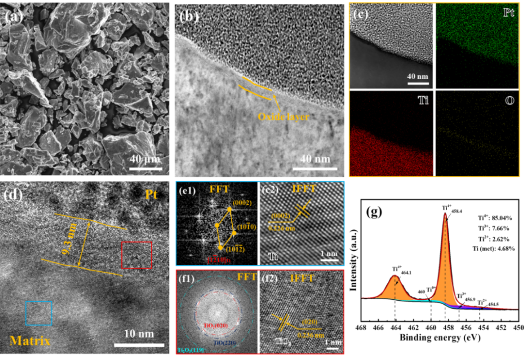 图1 (a) 原料钛粉SEM图; (b) 钛粉表面氧化膜TEM图; (c) 氧化膜元素面扫; (d)表面氧化膜HRTEM图; (e) 蓝框区域FFT图;(f) 红框区域IFFT图;(g) 原料钛粉XPS分析。