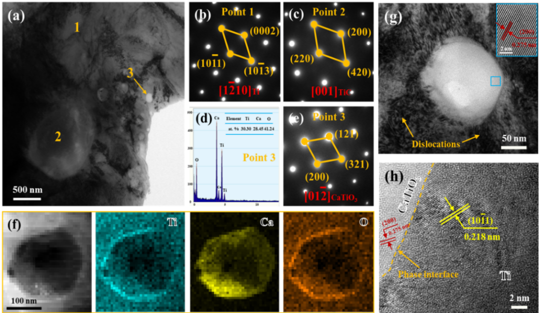 图3 Ti-0.4CaC2合金的TEM分析:(a) 明场图; (b-e) 点1-3的SAED衍射图; (d) 元素点扫图; (f) 元素面扫图; (g)衍生CaTiO3颗粒的高倍明场图; (h) 相界面HRTEM图。
