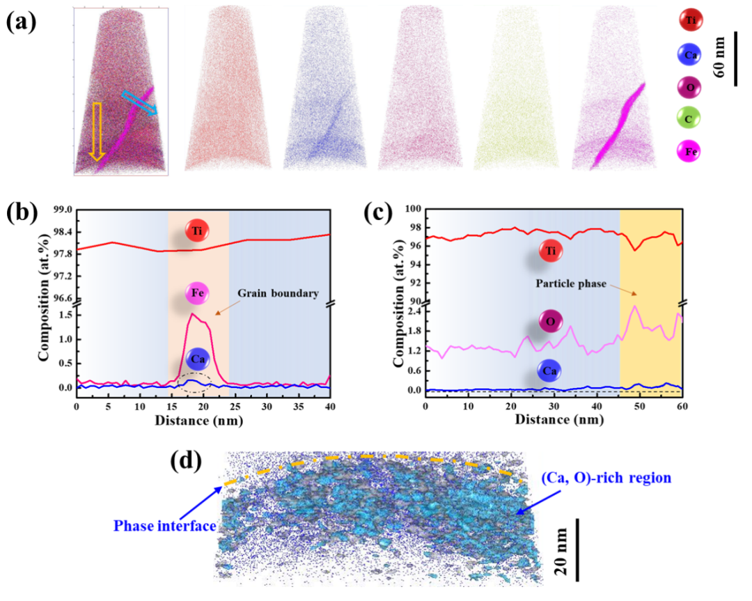 图4 Ti-0.4CaC2合金晶界处和含钙氧化物颗粒位置的APT分析:(a) Ti, Ca, O和C原子分布图; (b,c) 晶界和氧化物颗粒元素线扫图;(d) Ca、O原子三维重构图。