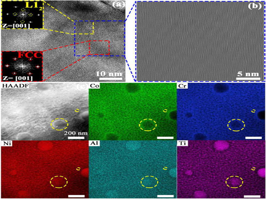 图8 H1000合金中L12析出相的相结构和元素分布。( a ) HRTEM图像和相应的FFT图像。黄色方框表示L12相的FFT,红色方框表示FCC基体的FFT。( b )显示FCC / L12相干界面的蓝色方框IFFT。( c ) L12析出相对应的TEM - EDS图谱。