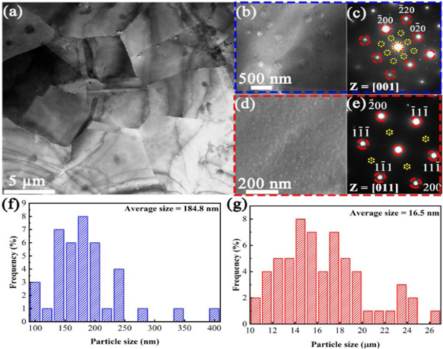 图6 H1000合金的TEM结果。( a )明场( BF )图像显示均匀的晶粒和微量的亚微米析出物。沿[ 001 ]方向拍摄的( b , c)暗场( Dark Field,DF )图像和相应的选区电子衍射( SAED )显示L12型亚微米析出相。沿[ 011 ]区域轴拍摄的( d , e) DF图像和相应的SAED显示L12型纳米析出相。( f , g)各区域亚微米级析出物和纳米级析出物的粒径分布。