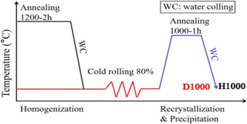 图1 目前Ni40Co30Cr20Al5i5合金的制备路线示意图。黑色曲线代表冷轧前均匀化的试样( H1000 )。红色曲线代表冷轧前未均匀化的试样( D1000 )。