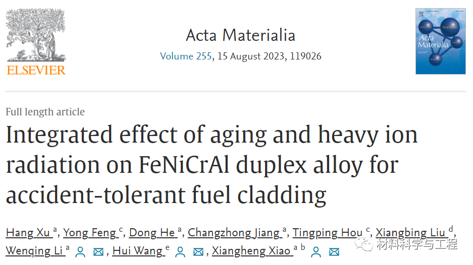 福岛核事故发生后,安全性更高的事故耐受燃料(ATF)包层引起了全世界的广泛关注。作为 ATF 包层最具竞争力的候选材料之一,FeCrAl 合金具有低成本和出色的高温抗氧化性。铬是铁铬铝合金的主要强化元素。然而,由于富含铬的α′相从富含铁的α基体中析出(即旋光分解),导致不良的硬化和脆性,因此含铬量高(>13 wt.%)的铁铬铝合金在中温环境(300∼450 ℃)下长期用于结构部件的应用受到限制。虽然已引入 Nb、Mo 或纳米氧化物等其他合金元素来强化合金,但仍难以满足对高强度薄覆层材料的苛刻要求。氧化铝形成的双相铁镍铬铝合金具有优异的机械性能和高温抗氧化性,一直被视为一种事故耐受燃料包壳材料。