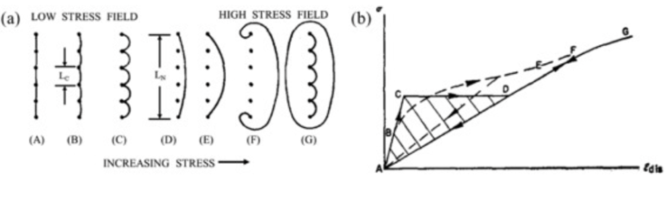 图1. G-L模型示意图。(a)由于施加的应力增加而使固定的位错线弯曲。杂质钉住决定的环路长度用Lc表示,网络决定的环路长度用LN表示。随着应力的增加,循环Lc向外弯曲,直到分离发生。对于非常大的应力,根据弗兰克-里德机制,位错成倍增加。(b)实线为图1(a)所示模型的应力应变规律。弹性应变已被减去,因此只显示位错应变。采用ABCDEF路径增加应力,采用FA路径减小应力。虚线曲线表示如果不是所有的循环都有相同的长度,但存在长度Lc的分布。