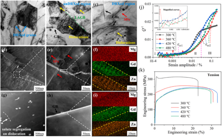 图4.。挤压态Mg-1.5Gd-1 Zn合金TEM-BF、HAADF-STEM图像、EDS图谱分析:(a, b, d-f) 300℃挤压态,(c,g-i) 420℃挤压态,(j)阻尼-应变幅值曲线,(k)拉伸应力-应变曲线。