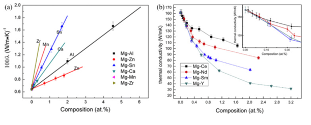 图7.溶质原子对某些二元镁合金导热性能的影响:(a)无RE二元镁合金和(b) Mg- RE二元合金。