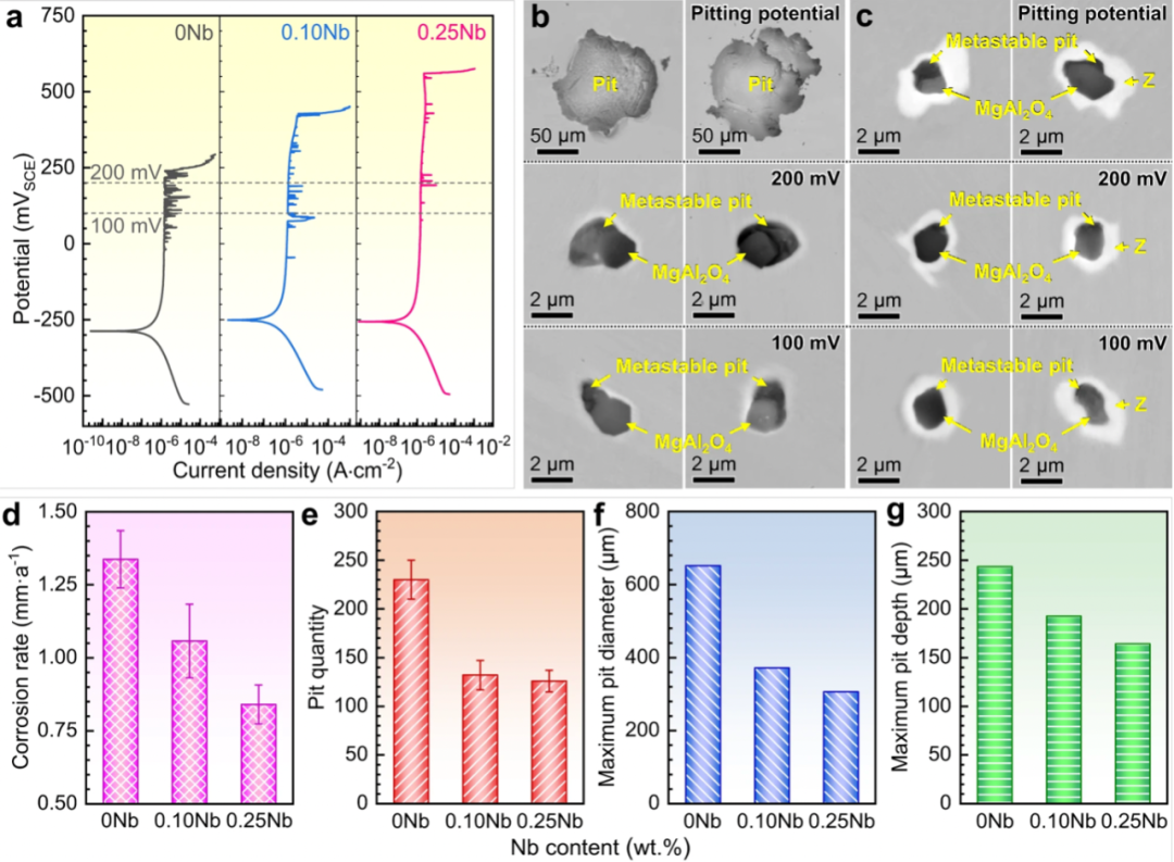 图3:S32205双相不锈钢的电化学和浸泡腐蚀行为。在72℃( p H 8.2 )双浓度模拟海水中的电化学腐蚀行为:b0Nb和c0.25 Nb钢的动电位极化曲线和腐蚀形貌。在50℃、6 % FeCl3溶液中浸泡12 h的腐蚀行为:d腐蚀速率,e试样表面点蚀坑数量,f最大点蚀坑直径,g最大点蚀坑深度。( d )和( e )中的所有误差条表示标准差( n = 3次独立实验)。源数据以源数据文件的形式提供。