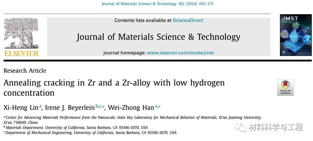 1. Lin XH, Beyerlein IJ*, Han WZ*, Annealing cracking in Zr and a Zr-alloy with low hydrogen concentration, Journal of Materials Science & Technology, 182 (2024) 165-175
