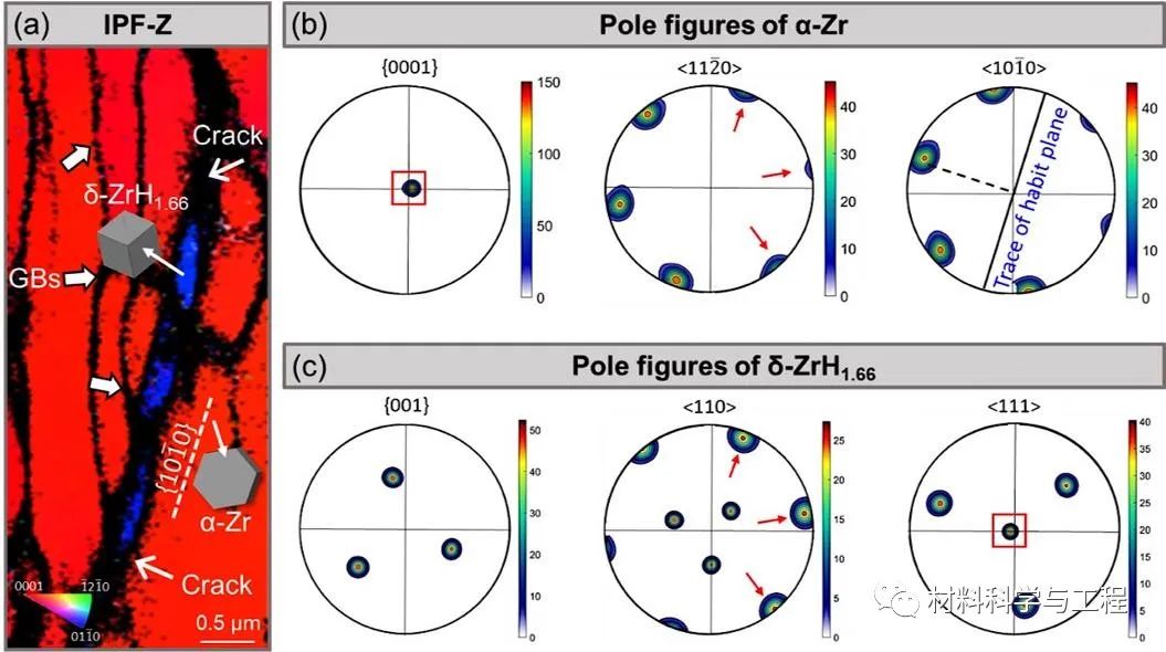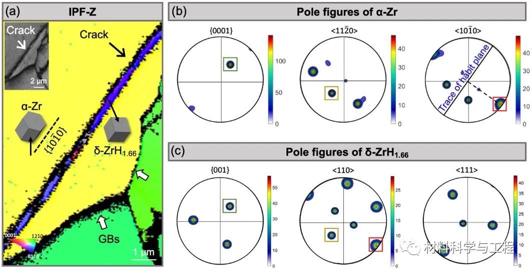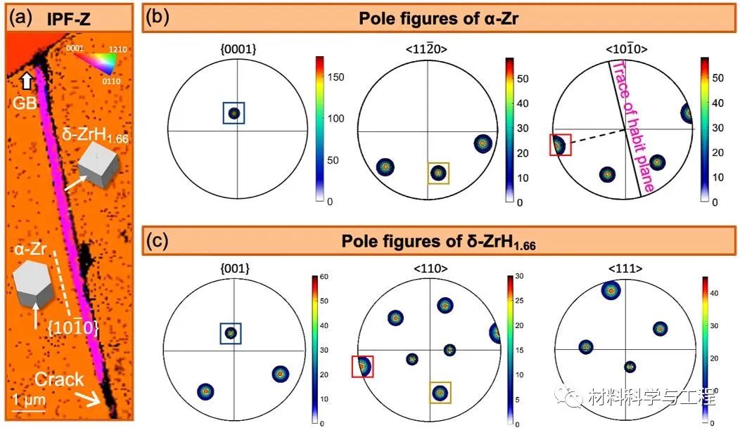 图8 Type-II型Zr-Sn-Nb-Fe合金中的裂纹及裂纹内部δ-氢化物的晶体学取向特征。(a) 取向图。(b),(c) α-Zr基体和δ-氢化物的极图。互相平行的晶体学面或晶体学方向用不同颜色的方框圈出。