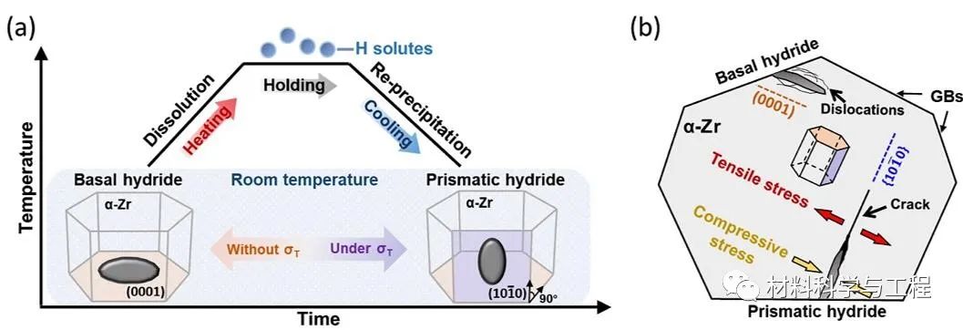 图9 应力诱导的δ-氢化物转向及转向氢化物导致组织开裂的机理示意图。(a) 退火热处理冷却过程发生的氢化物再取向现象示意图。在热膨胀内应力作用下,氢化物的惯习面由初始的(0001)基面转变为{10-10}柱面。(b) 柱面氢化物析出产生的膨胀应力导致α-Zr基体发生解理开裂。