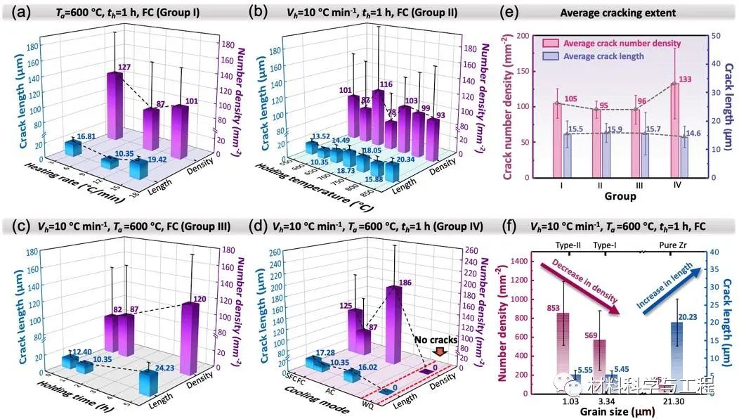 图2 导致材料退火开裂的可能影响因素分析。退火处理的 (a)升温速率,(b)保温温度,(c)保温时间,(d) 冷却速率对开裂程度的影响。(e) 不同影响因素对材料开裂影响的综合对比。Group I代表改变升温速率,Group II代表改变保温温度,Group III代表改变保温时间,Group IV代表改变冷却速率,不包括淬火。(f) 晶粒尺寸对开裂程度的影响。图中的误差棒是裂纹不均匀分布导致的。