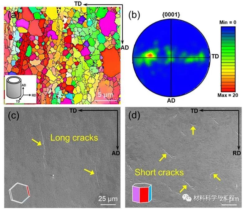 图10锆合金管加工织构对退火开裂的影响。(a) 取向图。(b) 显示{0001}基面织构的极图。(c),(d) 锆合金管不同平面上的退火裂纹扫描照片。在基面织构较强的平面(c),裂纹互相连接,长度较长;在基面织构较弱的平面(d),裂纹扩展受到晶界阻碍,长度较短。