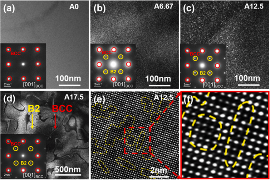 图2 . ( a ) A0合金,( b ) A6.67合金,( c ) A12.5合金和( f ) A17.5合金的TEM暗场像和相应的选区电子衍射( SAED )图谱。( d ) A12.5合金的HRTEM图像和( e ) BCC和B2 - CON的共格界面。
