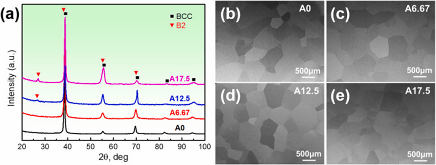 图1 . ( a )均匀化BCC - LHEAs的XRD图谱和( b、c、d、e) BSE图像。