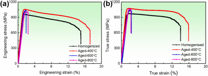 图3 .均匀化BCC - LWHEAs的拉伸应力-应变曲线。