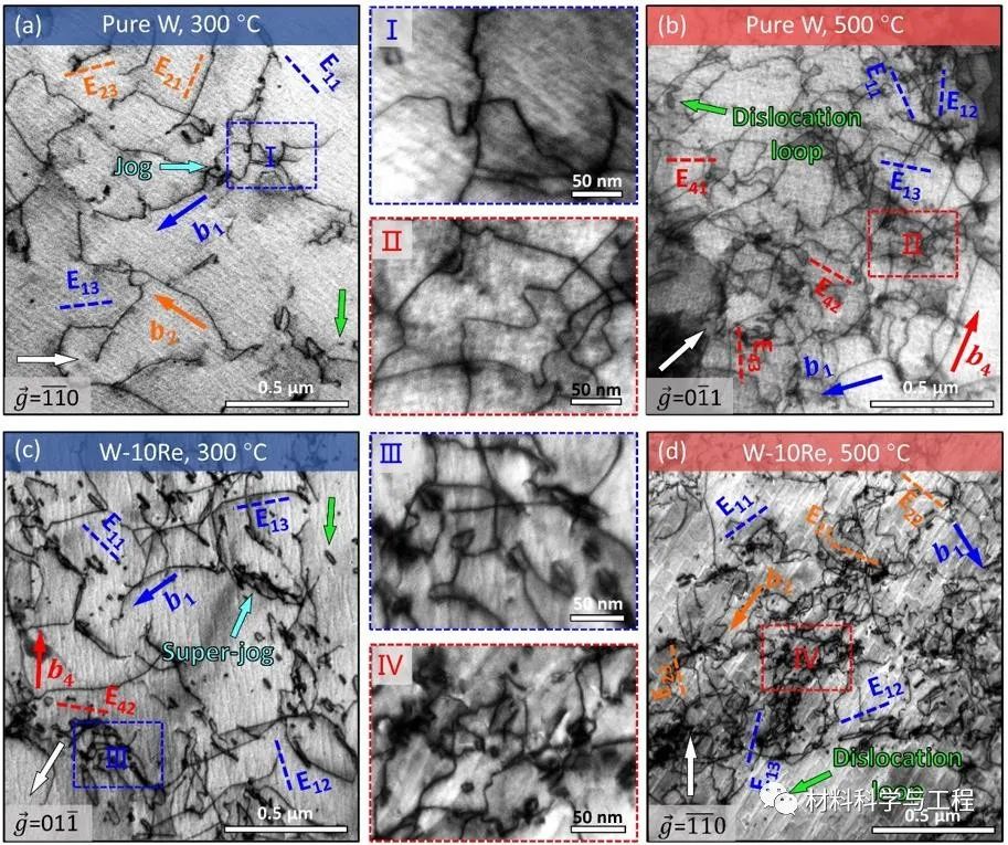 人造太阳-核聚变能是人类未来能源的终极解决方案。钨(W)因其具有高熔点、高温强度、高导热率、低氢(H/D/T)滞留率和抗辐照损伤等优异的性能,被誉为面向等离子体第一壁的最佳候选材料。然而,过渡金属钨的低温韧性差、韧脆转变温度高,极大地限制了钨的加工和应用。如何克服钨的低温脆性成为以钨为代表的难熔金属研究领域的关键科学难题之一。为此,各国研究者在钨的低温增韧方面开展了一系列的研究工作。长期以来,大量的模拟计算结果表明,铼(Re)合金化可以改变螺位错的三维核心结构,从而促进螺位错双扭折形核,提高螺位错的滑移能力,最终可改善W的变形能力,实现W的低温韧化。因此,Re被认为是提高W变形能力并降低其韧脆转变温度的最佳合金元素。在大量的实验研究中,报道的“Re效应”通常与机械加工(高温轧制等)引入的初始位错、层片结构、晶粒细化等因素混淆在一起,难以澄清单一因素(Re合金化)对W变形能力的影响。因此,Re合金化能否实现低温增韧、降低W的韧脆转变温度,一直缺乏系统的研究和关键的实验证据。近日,西安交通大学材料学院韩卫忠教授团队通过冲杆试验(Zhang YH, et al. Acta Materialia 220 (2021) 117332),对再结晶态的W-Re合金进行了系统研究,揭示了其韧脆转变的关键缺陷机制,并阐明了低含量(≤10 wt.%)的Re合金化并不能有效降低W的韧脆转变温度。研究人员发现Re合金化引起的有限韧化仅发生在很窄的低温区间(50 °C~200 °C)。高温(≥300 °C)变形时,W-Re合金的塑性变形能力明显降低,最终导致合金高温韧性下降、韧脆转变温度升高。而且Re含量越高,W-Re合金的韧脆转变温度越高(如图1所示)。通过表面变形形貌的表征发现,相比于纯W的沿晶开裂,Re合金化促进了更多的位错行为,从而增加了W-Re合金的低温韧性,但这一改善非常有限。此外,当变形温度升高到300 °C时,W-Re合金中还出现了大量的位错交滑移现象。随着Re含量的增加,交滑移程度越来越剧烈(如图2所示)。有趣的是,虽然W-Re合金在高温下发生了大量的位错交滑移,但其变形能力和韧性反而变差了。通过进一步的缺陷表征发现,随着温度升高,位错增殖能力的突然增加使得纯W发生了脆韧转变(Lu Y, et al. PNAS 118 (2021) e2110596118, Zhang YH, et al. JMST 141 (2023) 193–198)。然而,合金化后,Re元素在高温下促进了螺位错的局部交滑移,从而产生了横跨多个滑移面(三维结构)的超割阶和位错环。这些缺陷结构的密度和分布不仅和Re元素的含量相关,而且还表现出明显的温度依赖性:Re含量和变形温度越高,缺陷的密度越高(如图3所示)。高密度的三维不可动缺陷(超割阶和位错环)强烈地阻碍了位错的运动,最终导致W-Re合金高温变形能力下降、韧脆转变温度升高。图3:空间型的割阶和位错环导致了W-Re合金的高温硬化相关工作以“Unveiling the Intrinsic Rhenium Effect in Tungsten”为题发表在Acta Materialia 264 (2024) 119586。西安交通大学材料学院博士生张雨衡为论文第一作者,韩卫忠教授为论文通讯作者,合作者包括马恩教授和孙军院士。该工作得到了国家自然科学基金委员会优青项目和面上项目的共同资助。