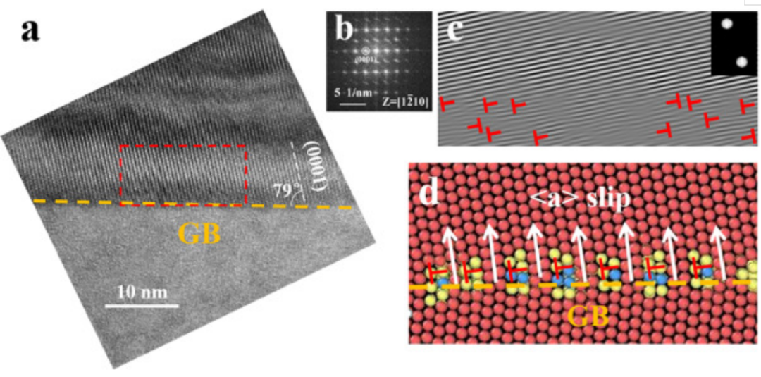 图15 (a) 变形后AZ80合金HAGB的HRTEM图像,(b) 图15a中上部晶粒的FFT图像,(b)图15a中红框区域滑移基底方向的IFFT图像,(d) (30-31)/(50-51) ATGB迁移的原子结构。在图15c和d中,边缘位错用红色标记。