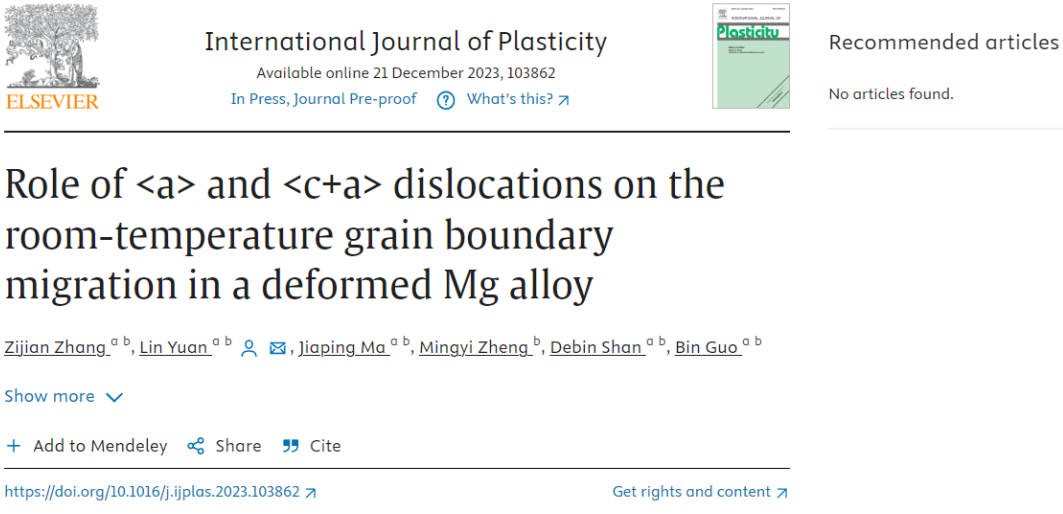 相关研究成果以“Role of <a> and <c+a> dislocations on the room-temperature grain boundary migration in a deformed Mg alloy”发表在International Journal of Plasticity上