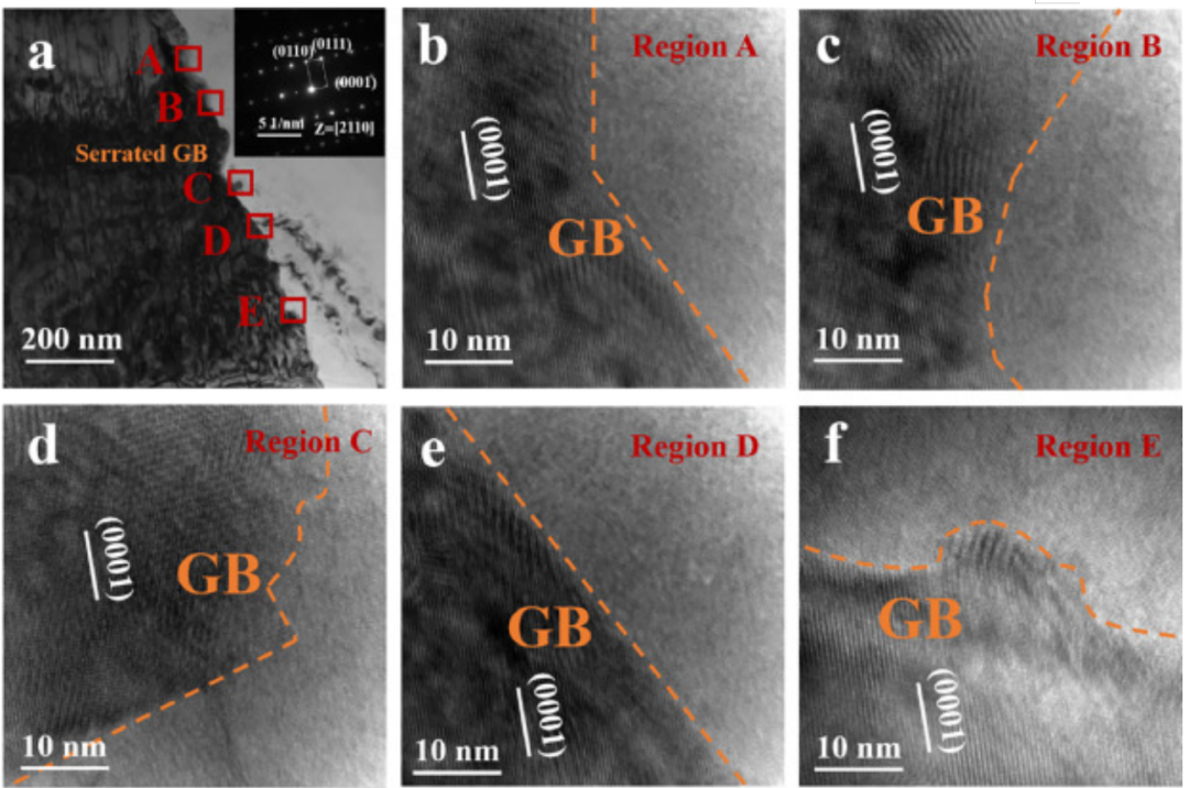 图8 锯齿状GB的TEM和HRTEM观测 (a)晶粒的亮场TEM图像和对应的SAED图案,红框表示选择用于HRTEM观测的5个区域,(b-f)图8a中5个区域的HRTEM图像(红框),在[21—1—0] 区轴下观测。橙色虚线表示图8(b-f)中的GB段