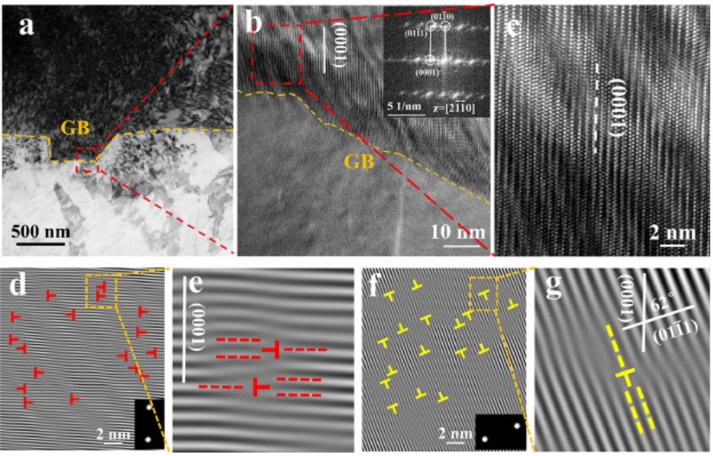 图9 锯齿状GB位错的TEM和HRTEM观察 (a) 亮场TEM图像,(b) 图9a中红框的HRTEM图像,在 [21—1—0] 带轴下观察到上部晶粒,插图为相应的FFT图像,(c) 图9b中红框的部分放大图像,(d) 图9d的基本滑移方向的IFFT图像,(e) 图9d的部分放大图像,(f)图9f的锥体滑移方向的IFFT图像。边缘位错在图9(d-g)中用红色和黄色标记。