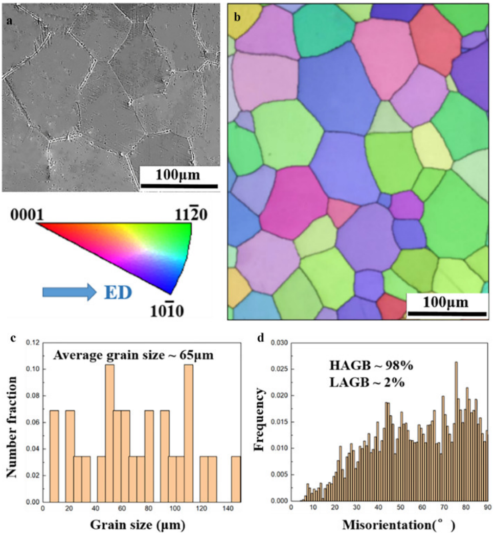 图3a和b为多轴压缩前初始合金的晶粒。SEM和逆极图(IPF)表明,挤压后的合金晶粒粗大,具有广泛的扁平GB,高温热处理后几乎看不到第二相。图3b的粒度统计图显示,平均粒度约为65 μm(图3c)。图3d统计了图3b的大角度GB (hagb, GB偏差>10°)的GB偏差,其比例为98%。
