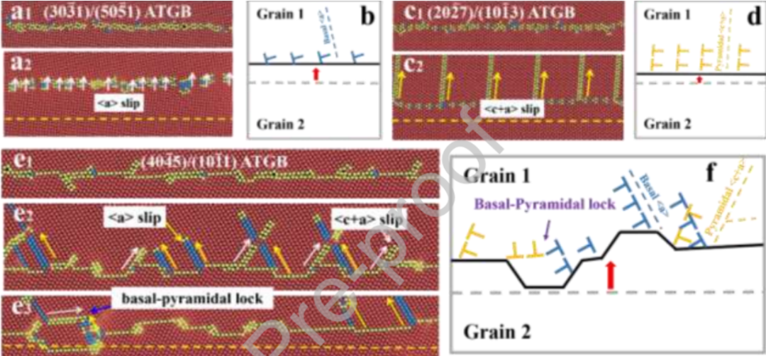 本研究通过实验观察和MD模拟,在原子尺度上讨论、分析和建模了变形合金中平坦和起齿晶界段的<a>和<c+a>位错的塑性行为,探究了室温下<a>和<c+a>位错对晶界迁移的作用。主要成果如下:
