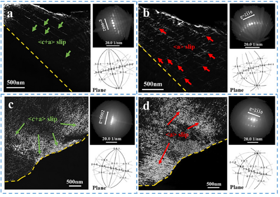 图13. AZ80合金室温多轴压缩三道次后的位错分析(a)[0001]区轴下晶粒的亮场TEM图像(b)图13a的SAED图和观测面原理图,(c)HADDF-STEM图像,(d)HRTEM图像。图13d中黄色框处存在晶格畸变。