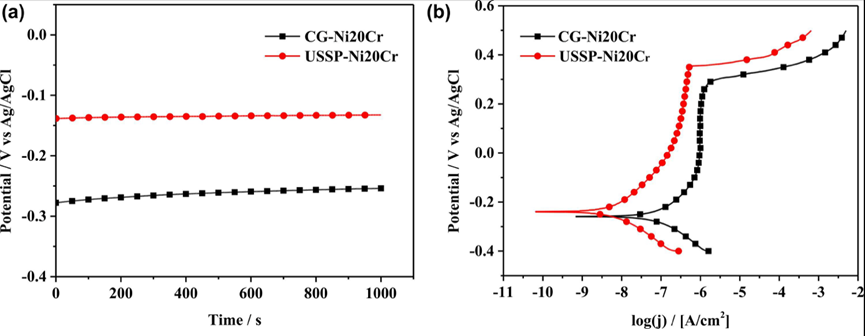 图 7:室温下 CG-Ni20Cr 和 USSP-Ni20Cr 合金在 3.5 wt%氯化钠溶液中的 (a) OCP 瞬态和 (b) 极化曲线。