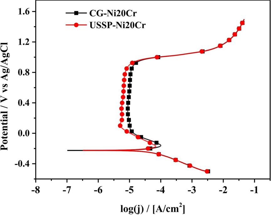 图 8. CG-Ni20Cr 和 USSP-Ni20Cr 合金在室温下 0.5 mol/L H2SO4溶液中的极化曲线。阳极钝化曲线以 1 mV/s 的扫描速率进行扫描。
