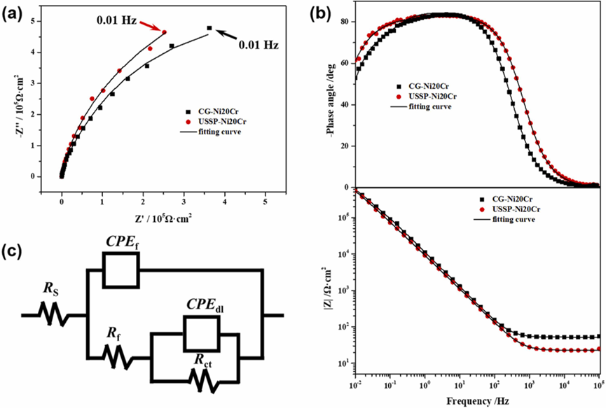 图 9. 镍 20Cr 合金在 3.5 wt% 氯化钠溶液中进行 USSP 处理前后的 EIS:(a)奈奎斯特图;(b)相应的 Bode 图。(c) 等效电路拟合 EIS 数据。