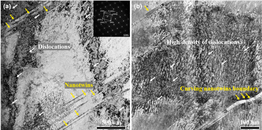 图 4. (a) TEM 明场图像显示 USSP-Ni20Cr 样品最顶端 5 µm 层存在大量纳米线(黄色箭头所示)和位错壁(白色箭头所示)。插图为其 SAED 图样。(b) STEM 明场图像,显示在与 (a) 相同的深度区域,高密度位错相切并形成弯曲的纳米孪晶边界。