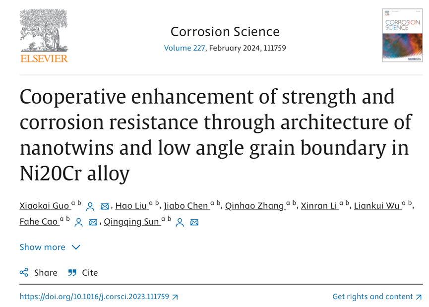 中山大学曹发和教授团队利用 USSP 塑性变形法在 Ni20Cr 二元合金中制造梯度纳米结构,并揭示其强化和腐蚀机理。利用扫描电子显微镜(SEM)和高分辨率透射电子显微镜(HRTEM)研究了镍铬合金中梯度微结构的强化和变形机制。通过电化学腐蚀测量和 X 射线光电子能谱(XPS)研究了含 USSP 和不含 USSP 的 Ni20Cr 合金的腐蚀特性和机理。将系统揭示 Ni20Cr 合金的梯度纳米结构、表面硬度、强度、延展性和腐蚀性能之间的关系。相关研究成果以题“Cooperative enhancement of strength and corrosion resistance through architecture of nanotwins and low angle grain boundary in Ni20Cr alloy”发表在Corrosion Science上。