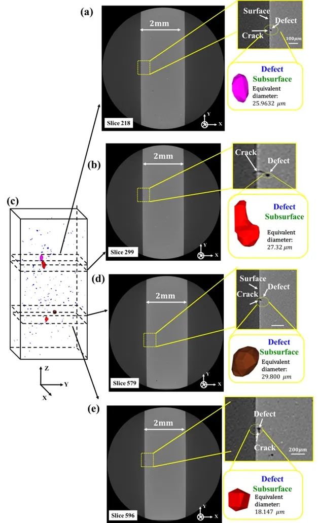 图3 3D渲染后的#1-F-28(, N cycle)的缺陷:(a)(b)(d)(e)亚表面缺陷; (c)亚表面缺陷位置(为提升分辨率采取了局部放大)