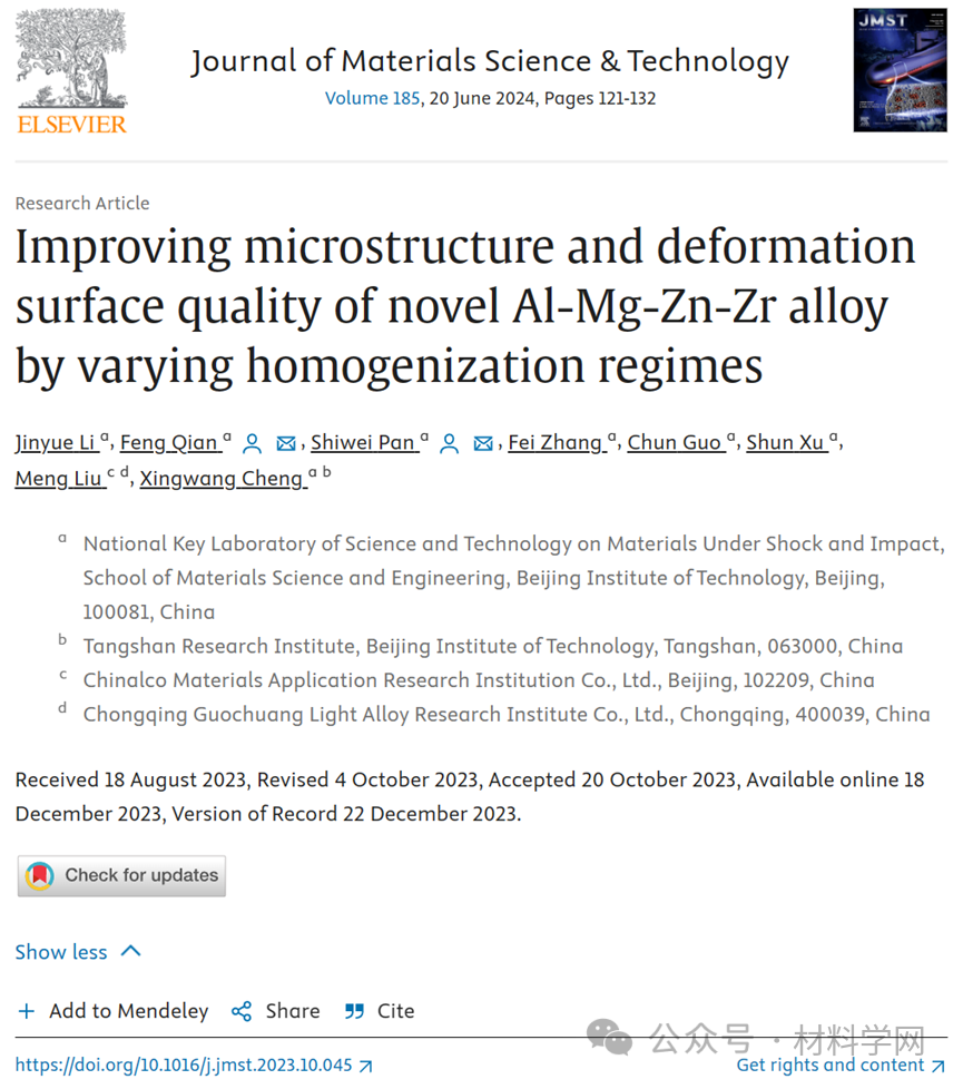 在这项工作中,我们开发了一种高镁含量(7 wt.%)和高镁锌比(3.5)的 Al-Mg-Zn-Zr 合金,并根据不同的机理设计了三种不同的均质机制,如表 1 所示 同时,还研究了不同均质机制对微观结构和机械性能的影响。利用扫描电子显微镜(SEM)、透射电子显微镜(TEM)和差示扫描量热仪(DSC)进行了详细的表征,以揭示均质化过程中共晶相和析出分散体的演变。通过电子反向散射衍射(EBSD)评估了轧制和退火后微观结构相应的抗再结晶性。此外,还仔细分析了塑性不稳定性行为,包括吕德斯带和 PLC 效应,最终确认了优化的均质化机制。相关研究由北京理工大学材料科学与工程学院钱锋副教授和潘士伟博士后合作进行,其相关研究成果过以“Improving microstructure and deformation surface quality of novel Al-Mg-Zn-Zr alloy by varying homogenization regimes”为题,发表在Journal of Materials Science & Technology上。