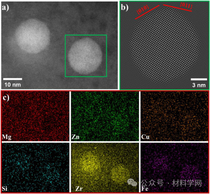 图 5 (a)DHT 样品中 Al3Zr 分散体的 STEM-HAADF 图像;(b)(a)中绿色矩形标记区域的傅立叶滤波图像;(c)EDS 图谱结果,显示了(a)中各元素的分布情况。