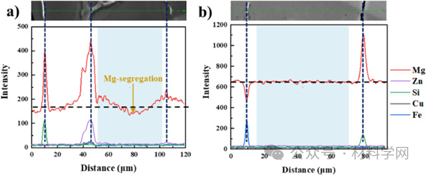 图 4 不同状态下 Al-Mg-Zn-Zr 样品的 EDS 线扫描分析:(a)铸件,(b)DHT(垂直虚线标出金属间相的位置)。