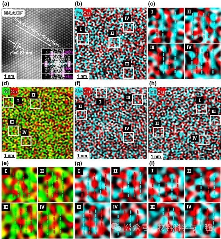 图2. 短程有序结构定性表征。(a) BCC*相高分辨TEM图像,插图为该区域傅里叶变换(FFT)图像,处漫散射点为短程有序结构典型特征,白色箭头所示为元素线扫方向示意图,r*的实验测量结构在图中标出;(b) Fe-Cu,(d) Al-Cu,(f) Co-Cu,(h) Ni-Cu原子对元素分布图及(c, e, g, i) 具有短程有序结构区域的放大图;红色虚线代表Cu富集原子面,青色和红色虚线分别代表Fe/Co/Ni和Al富集原子面。