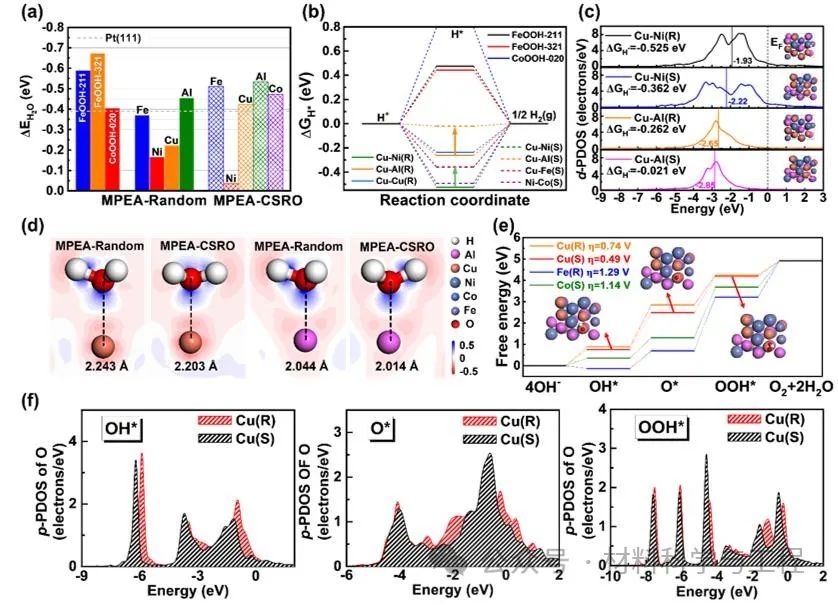 图5. 密度泛函理论模拟。FeOOH-211, FeOOH-321, CoOOH-020, MPEA-Random, MPEA-CSRO模型的 (a) 水分子吸附能()和 (b) 氢质子吉布斯自由能(ΔGH*),箭头指示了短程有序结构对位点氢质子吸脱附的促进作用,(R)和(S)分别代表MPEA-Random和MPEA-CSRO模型;(c) 氢质子吸附在Cu-Ni和Cu-Al位点后d轨道分波态密度图,黑色垂直实线显示d带中心,黑色垂直虚线显示费米能级,插图为相应的原子构型;(d) 水分子吸附在Cu、Al位点后的二维电荷分布图,红色和蓝色分别代表电荷的消耗和积累;(e)零电势(U=0.0V)下MPEA-Random和MPEA-CSRO模型中Cu、Fe、Co活性位点析氧反应自由能台阶图;(f) 中间产物OH*、O*、OOH*吸附在MPEA-Random和MPEA-CSRO模型中Cu位点时p轨道分波态密度图。