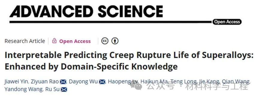 河北科技大学苏孺教授团队联合德国马普所和北京科技大学的学者提出了一种基于领域专业知识增强的机器学习模型,用于高温合金蠕变寿命的可解释性预测。通过评估热处理工艺对高温合金蠕变性能的影响,成功实现了高精度的蠕变寿命预测。这项工作基于成分-工艺-性能之间的联系,采用了嵌入领域专业知识的分类和回归模型,深入研究了热处理工艺对高温合金蠕变性能的影响,成功评估了热处理工艺并准确预测了高温合金的蠕变寿命,最终实现了对热处理工艺的逆向优化,将蠕变性能提升了5.5倍以上。相关工作以题为“Interpretable predicting creep rupture life of superalloys: enhanced by domain-specific knowledge”的研究性文章发表在《Advanced Science》。河北科技大学硕士研究生殷嘉维为论文第一作者,马普所饶梓元研究员、河北科技大学吴大勇副教授、苏孺教授为论文的通讯作者。