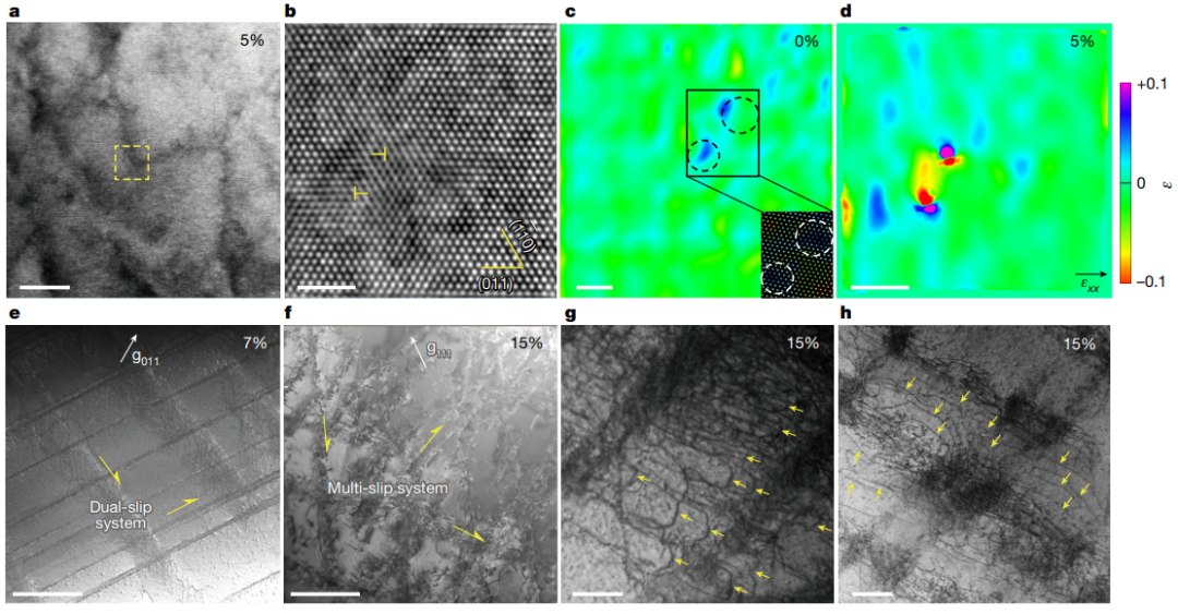 接下来,作者分析了第二次θ上升的基本机制。研究认为,第一次θ上升导致真应力增加了100 MPa(图1a)。除了首选的滑移系{101}<111>外,塑料变形有助于在第二阶段末端(7%,图4e)激活第二个滑移系统(112)[111]。因此,在多元合金内部形成了不同方向的滑移带,允许不同滑移面上的位错相互作用。这些相互作用有效地阻碍位错运动,从而补偿了由于位错运动引起的应变硬化能力下降,因此位错强化机制解释了这一独特的应变硬化行为。