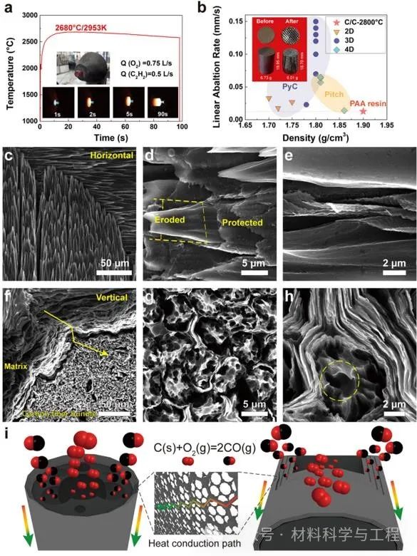 图6高密度C/C复合材料的耐烧蚀性能分析。(a)温度变化,(b)线性烧蚀率比较,(c-h)SEM图像和(i)耐烧蚀机理阐释