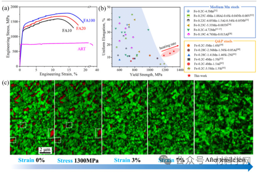 图 4:(a)FA和 ART 试样的工程应力-应变曲线;(b)FA 钢与其他 MMS 和 Q&P 钢(锰含量低于 5.5 wt.%)的机械性能(屈服强度 vs 均匀伸长率)比较;(c)随着应变的增加,一系列原位 EBSD IQ 图与 FA100 的RD-TD 平面上的相图叠加。