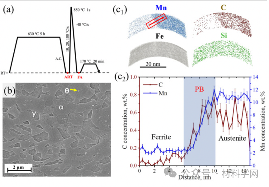 (b) 显示 ART 试样多相微观结构的扫描电镜图像,由 α-铁素体、γ-奥氏体和 θ-冰晶石组成;(c) ART 试样的三维 APT 重建:(c1) Mn、C、Fe 和 Si 的元素分布图;c2) Mn 和C 沿图 1c1 中箭头的一维剖面图。PB 为相边界。