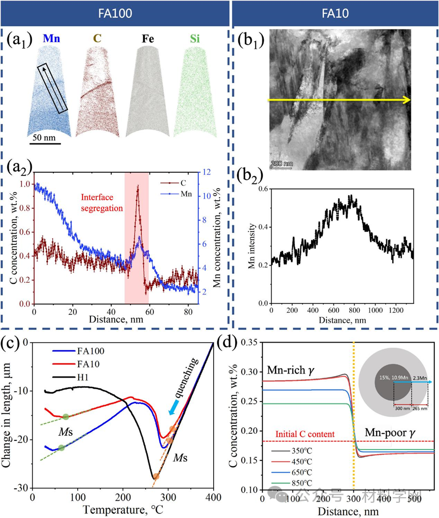 (c) 显示 FA100、FA10 和 H1 试样中马氏体转变的稀释曲线,其中 Ms 指马氏体开始温度;(d) C 分布在 FA100、FA10 和 H1 试样中的变化。3b1;(c)显示 FA100、FA10 和 H1 试样中马氏体转变的扩张曲线,其中 Ms 指马氏体开始温度;(d)DICTRA模拟的 FA100 连续冷却过程中 C 分布的演变。