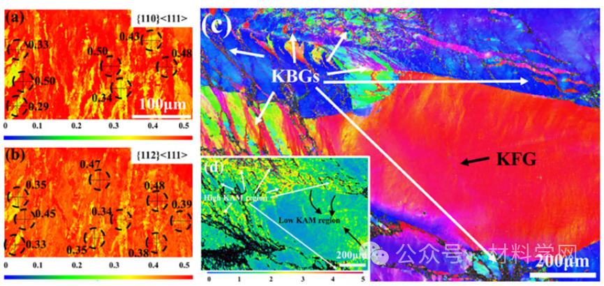 图11 KBs-800 °C/0.5 h样品的EBSD分析。图8(c)中黑匣子的最大SF图(a){110} <111>和最大SF图(b){112} <111>,显示了矩阵和KBs之间的滑移趋势差异;(c)拉伸断裂附近的ND取向图,其中白色箭头表示KBG,黑色箭头表示KFG;(d)(c)的KAM图,其中白色箭头表示KBG中的高KAM区域,而黑色箭头表示KFG内的KAM梯度。