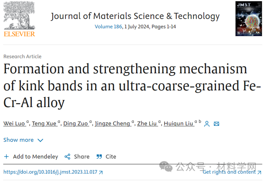 相关研究成果以题“Formation and strengthening mechanism of kink bands in an ultra-coarse-grained Fe-Cr-Al alloy”发表在国际期刊Journal of Material Science & Technology上。