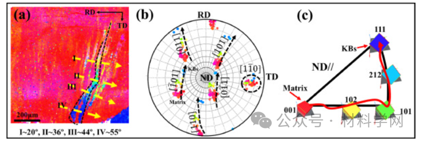 图3 EBSD对KBs取向演变的分析。(a) 法线方向图(ND);(b) 矩阵和知识库的{110}PF;(c) 知识库定向演化路径的IPF。