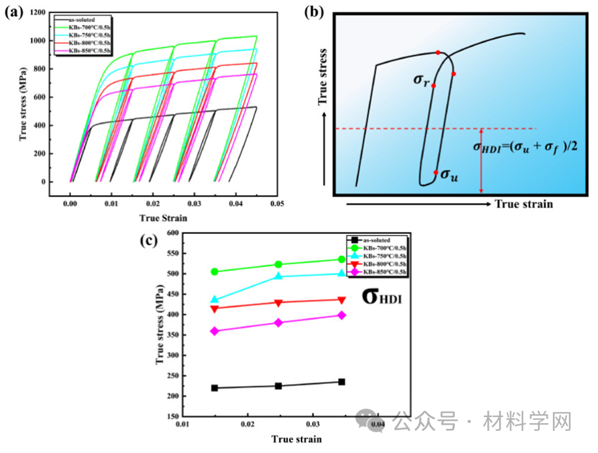 (3) 在室温下,KBs可以显著提高合金的屈服强度,达到225.5 MPa的最大值。KBs的强化效应可分为两个方面:对原始晶粒的异质性细化效应,以及基体与KB、KBGs和KFGs位错差异对HDI的强化效应。HDI强化贡献是一个与退火温度密切相关的变量。