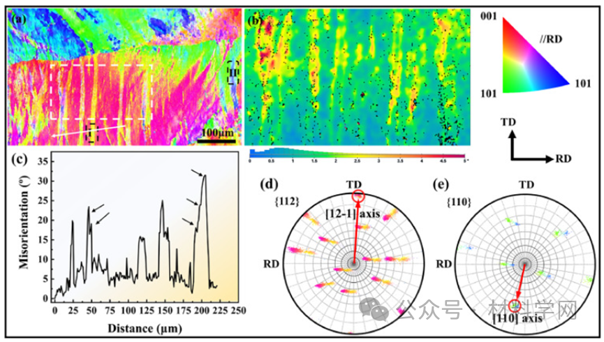 图2 Fe-Cr-Al合金热轧显微组织的EBSD分析:(a)轧制方向取向图(RD);(b) (a)中白色虚线框区域的KAM图;(c)沿区域I.的白色箭头的累积取向误差分析;(d) I.区的{112}PF;(e) 第二区域的{110}PF。